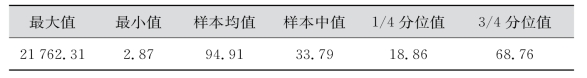 总市值最大的为21 762.31亿元,市值最小的为2.87亿元。全部样本在此间分布并不均衡,其中均值为94.91亿元,中值为33.79亿元,四分之一分位值和四分之三分位值分别为18.86亿元和68.76亿元,如表7-10所示。