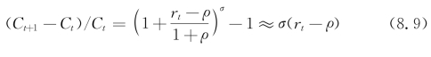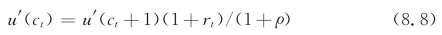 其中,u(·)为效用函数,ct为t期的消费,ρ为时间偏好率。假设相对风险规避度-ctu″(ct)/u′(ct)为常量σ-1,结合(8.8)整理可得: