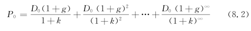 永续增长模型又称Gordon增长模型(Gordon,1962),用来估计处于“稳定状态”的公司的股票价值,该模型假设这些公司的股利预计在一段很长的时间内以某一固定的速度增长,并假设这一固定增长率为g,则式(8.1)变成: