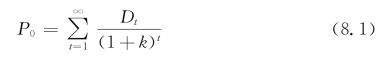 美国著名投资理论家约翰·威廉斯(John Burr Williams,1938)在《投资价值理论》(The Theory of Investment Value)一书中,提出了贴现现金流估值模型。该模型在后来的几十年里一直被人们奉为股票估值的经典模型。威廉斯认为,投资者投资股票的目的是为了获得对未来股利的索取权,对于投资者来说未来现金流就是自己未来获得的股利,企业的内在价值应该是投资者所能获得的所有股利的现值。由此,威廉斯推出了以股利贴现来确认股票内在价值的最一般的表达式。其用公式表示如式(8.1):