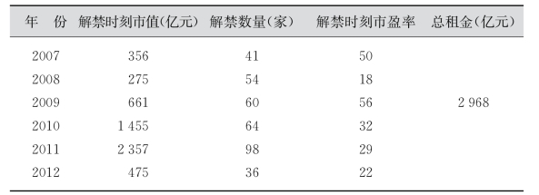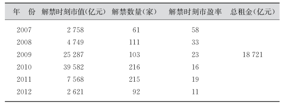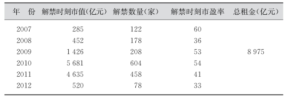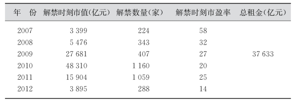 表8-12详细列出了全部IPO限售股2007—2012年的解禁市值、解禁数量、解禁时刻市盈率及总租金计算结果。