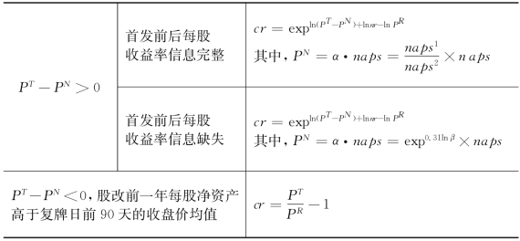 (1)一般计算公式。当股改前一年每股净资产低于复牌日前90天收盘价均值的条件满足时,合理对价率的计算公式如下式:cr=其中,当首发前后每股收益率信息完整时,