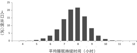 正如前一章所讨论的,两种主要的时间类型的人(早起型和晚起型)睡眠质量、持续时间和时间点,是彼此独立的。在一个群体中,睡眠持续时间是钟形分布的,可以与睡眠时间的钟形曲线对照(见前一章节)。下图我们可以看到,多数人都在左边(短时睡眠者),少数人在右边(长时睡眠者)。