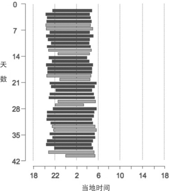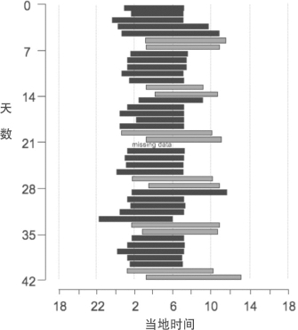 [1]在工作日的睡眠时间用黑色方块表示,在休息日的睡眠时间用灰色方块表示。写日记的这几天的睡眠时间顺序用纵轴表示,顺序为从上到下。横轴为当地时间,从18点到第二天18点。