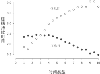 休息日的睡眠持续时间(空心点)反映了不同时间类型的人在工作日里积累了疲劳之后补觉的情况。较晚时间类型的人在工作日里共缺少大约6.5小时的睡眠,因此在休息日里的睡眠持续时间为9小时或以上。有些人必须在休息日里睡半天才能平衡缺乏的睡眠。我把上面这幅图称为“睡眠剪刀”。