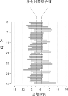 较晚时间类型的苏醒过程中最有特点的是睡眠时间的反复变换模式(在闹钟的帮助下,工作日醒得很早,在休息日却醒得很晚,如此循环)。这种来回的变化类似奥斯卡和杰瑞[3]坐飞机在不同时区之间的旅行。较晚时间类型的人们所写的睡眠日记,也是反映了这一特征,就像人们在每个周五从欧洲飞到美国东海岸,周一再飞回来一样。