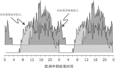 不同时间类型的人的作息时间与他们各自的睡眠/苏醒类型是一致的。下文的分析显示了被试者在秋季冬令时调整前的4个星期的休息日活动——前面是典型的较早时间类型的人,后面是时间类型较晚的人。较早时间类型的人从6点开始就活跃起来,较晚时间类型的人10点半才开始活跃起来。两种类型的人同时结束一天的活动。在这个特殊的例子里,较晚时间类型的人睡眠时间略长一些(从他们不活跃的时间来看)[7]。