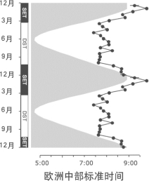 我们的日常生活与太阳升起之间的联系紧密得令人惊讶——至少休息日的时候如此。与太阳升起时间一同变化的是,从3月开始人们的平均起床时间就越来越早。我们的体内时间跟随着太阳升起的时间而变化,正如我们在前文研究中猜测的那样。但是我们的志愿者起床的时间看起来只在冬季里跟随太阳升起的时间变化。一旦中欧进入3月的最后一个星期,即夏令时开始[5],苏醒时间就不再跟随太阳升起时间变化了,而是保持整个夏天在7点45左右醒来(发生小幅度变化),相当于夏令时的8点45。到10月份的最后一个星期日,社会时间回到了正常的太阳时间,苏醒时间立刻开始以太阳升起时间为校准了。体内时间的校准(即时间类型)适应了季节的变化。但是为什么这种校准只发生在冬季?难道这是生物钟自发进行的夏令时调整吗?
