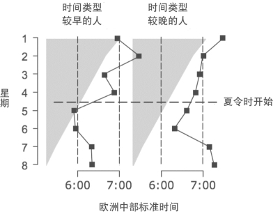 [8]图表中标记的只是基准点,我们把志愿者开始活跃的时间起始点定为7点,然后每个星期计算一次起始点推迟了多少。请注意,所有相关图表的时间均为欧洲中部标准时间。如果所有参加实验的志愿者都遵守了夏冬令时调整的时间,那么尽管当地时间保持不变,他们起床的时间也会早或者晚1小时。