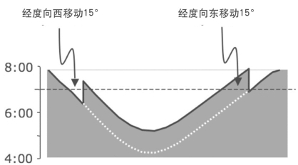 春季调整夏令时的时候,生物钟向后倒3个星期(例如住在法兰克福的英格利特和埃德加),相当于向西走了15个纬度;到了调整为冬令时的时候,我们的生物钟又向后倒了3个星期,相当于向东走了15个纬度。夏冬令时的时间调整后,太阳升起的季节变化对我们的日常生活的影响减弱了许多(白色的线显示了没有夏冬令时调整情况下太阳升起的时间)。太阳升起的季节变化变弱,相当于我们向赤道方向前进。对于中欧人来说,相当于从法兰克福到摩洛哥再回来。