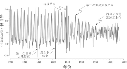 重要的社会事件,例如战争,可能会使原本非常有规律的出生节律产生很大的改变。在第二次世界大战之后,出生节律的变化逐渐减小,但是一直持续到20世纪60年代,小高峰从春季推迟到了早冬时节。正是在这个时期,弗朗哥发动了政治运动,西班牙的乡村也迅速开始工业化了。