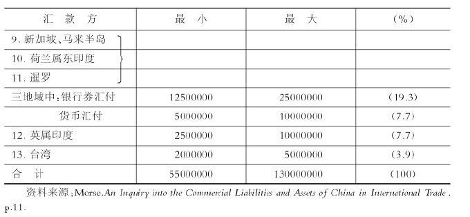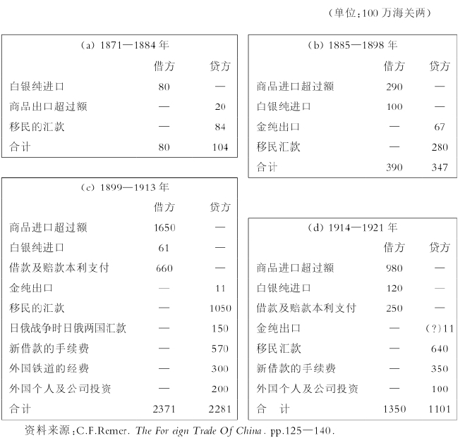在资产项目m中见到的中国移民的本国汇款问题,是在考虑中国国际收支的问题上,马士指出的重要内容。马士最初是在年度海关贸易报告的片断以外,对中国的国际收支整体进行论述的。事实上,这部分华侨汇款,大大弥补了资产项目的不足。但是,现在要具体探讨它的内在实情时,像马士指出的那样,那些签了海外渡航契约的苦力,最初的一二年间,为了返还出国前的借债和旅费根本没有积蓄,而他们对在中国的契约者连续不断的汇款,使得契约者把它们用来充当获得新苦力的预付款和旅费。也就是说,华侨汇款的最初的动机,是为了返还其借款,而这样的汇款就与新的中国劳动力出口增加相联系了。这个时期,正是1860年代的黑人奴隶贸易禁止以后的苦力出口热潮,东南亚为了锡矿山和橡胶园的开拓而出现了大量的移民。但是,这一华侨汇款的项目,不只是作为汇款,也应该作为国际性的劳动力移动的问题来探讨。所以,它与前面谈到过的项目F同样,是收支界限划分不明的项目。特别是移居海外劳动力的大部分是从华南地方出去的,所以,我认为,与其像马士那样在国民经济中做探讨,还不如把它作为华南地域经济问题的一环,把它与先前的转口贸易联系起来分析更为切合实际。关于这点将在第三章第三节中探讨。