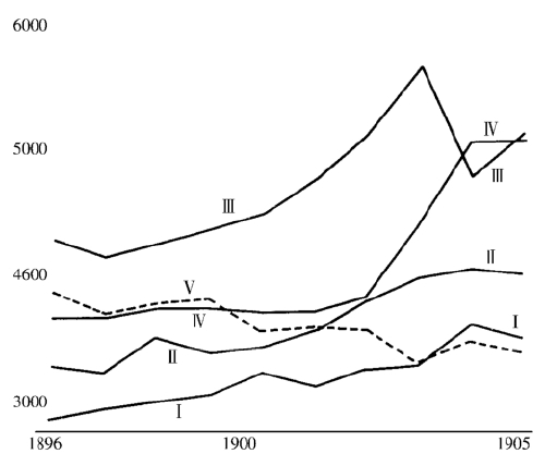 香港绝不是造成“中国的”贸易统计混乱的主要原因。香港既接受向华南诸港出口的外国商品,也接受向外国出口的中国产品以及面向中国国内市场的商品。即使在1864年帆船运输时代,运输速度缓慢也并没有受到非议。那个时期(1864年)前后,经由香港的中国进口为31%,出口为14%;1904年增加为进口40%,出口36%。