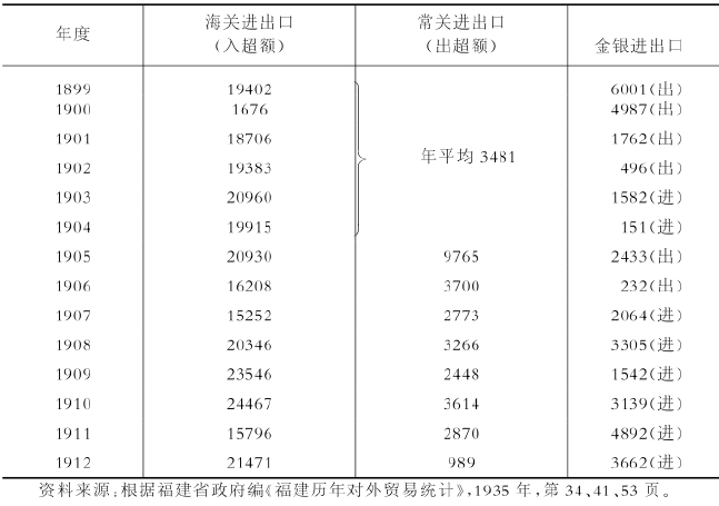由于马士把华侨汇款纳入了中国国际收支项目中,使收支向平衡迈进了一步。也就是说,我们可以这样来把握,华侨尤其是东南亚华侨的汇款发挥了抵消贸易收支及金银收支逆差的作用。表2-15以福建省为例,显示贸易收支与金银收支的关系问题。用金银收支入超来弥补包括常关(沿海帆船贸易)的贸易收支的入超,同时能够推测,金银收支的剩余大概被充作投资或其他的资金了。