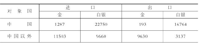 马士提出的第三个问题是关于金银贸易。他对于香港的金银进出口加上了下面的评注(参见表2-14)。“如果这个数字是正确的,那么香港的金银合计为15475000余海关两,也就是说,银行有着相当于约2350万美元余额的储蓄,其中1900万美元是白银。”马士着眼于转口港香港的金融职能,表示香港存在着作为外国银行资金运用的金银,若把它与中国的国际收支关系联系起来考虑,也鉴于表2-14白银的移动情况主要发生在中国与香港之间,我们能够从金融方面明确的一点就是,只有把香港包含在内才能理解中国经济的内在关系。