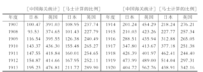 在上面的统计里,英国不过占了海关统计的60.8%,而日本却占到了海关统计的108.45%。如果用此比率修改计算,就成了表2-20.