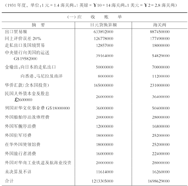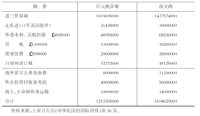 探讨中华民国时期的国际收支问题,有土屋计左右的《中华民国的国际贷借》(参照表2-21)。在这里,在国际收支的统计项目中,要注意三点,即出口的评价误差预测在20%,计入走私或国境贸易和以金出口计算,这三点都是为了更准确把握中国国际收支的整体情况,而试图在统计项目上进行加工的结果。如果将担当国际收支各项目各自经济活动的活动主体,即中国的官与民、在外华侨、与外国相关的在中国的各种各样形态(合办及其他)的经济活动以及在各式各样的场所(开放口岸、租界等)中的各外国经济活动考虑在内,与其尝试着在收敛国民经济的争论方向上把握中国经济的整体形象,倒不如更有必要在项目各自内容的思考和项目的相互关系上,进行更加深入的研究。