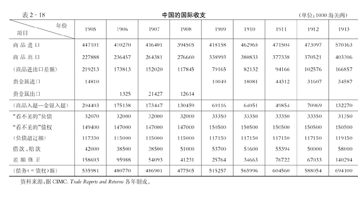 从这个关系图可以看出,使上海资金增大的诸要素,随着进、出口发展,共同发挥了连接东亚(关于日本在后面论述)及东南亚的强大作用,与交易关系上的作用互为表里,于是,香港承担了金融关系中进一步扩大的多边决算、汇款转口作用。马士在关于m项华侨汇款问题上,推算了不同国别、不同都市的华侨向本国的汇款额,在表2-16、表2-17中,做成中国国际收支中最大的“看不见的”债权项目。当然,为了把国家的国际收支搞清楚,以该国的经济活动存在方式及其构成它们的各种对外关系的存在方式为基础,明确揭示出其基本的经济构造。1905-1913年,由中国海关统计的国际收支(参见表2-18)中就能够发现其特定的形态。也就是说,贸易收支中的入超不是由金银出口来保证均衡的,入超是由贸易外收支的黑字来弥补的。它一方面要求总计项目、总计方法上的精致化,同时,若依马士所见,更为根本的是在国民经济的框架内存在着难以补足的资金移动与经济活动。尤其应该留意与东南亚的结合——杂货出口、米进口、华侨汇款——也有必要明确以香港为中转站的资金循环作用。在此与其把中国经济看做是在单一、共同基础上进行的,不如将其看做在不同地域内相对独立进行的。马士是尝试将国际收支作为整体来把握,我们反而能够从他的议论中,发现中国地域经济发挥作用的实际状态。