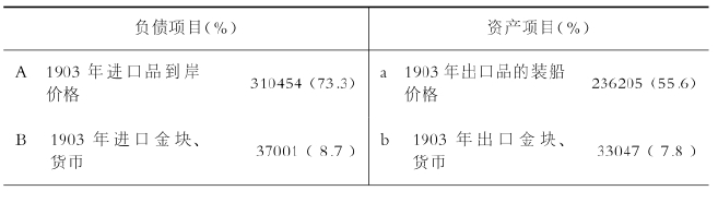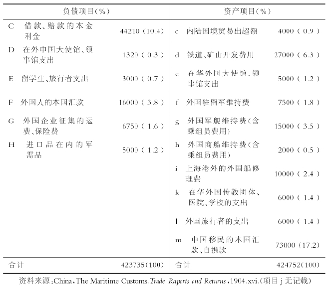 为谋求收支上的平衡,马士列举了涉及贸易外收支的诸项目(参见表2-11),根据这个表,外国借款及其赔款占了负债额的第二位。现在,我想就表中F和m两个项目来进行具体探讨。首先在F项目中,马士对在中国的外国人(企业),是没有区分居住与非居住而放在一起统计的,这在资产项目变动部分本来是应该考虑的。事实上,在关于项目F的说明中,马士把从各开放口岸(租界)来的房地产租赁费以及在中国的外国企业的红利,几乎都算做了在中国的外国人的汇款部分。其结果,他把香港也包括在内,把香港作为“本质上的中国商业的一个构成部分”加入了国际收支计算。但是,在另外的地方,如在1903年的贸易报告中,又有这样的记载:香港从中国吸收了100万海关两的币材,在统计上又把中国与香港相区别了。所以,把香港视做中国经济的一部分呢,还是把它除外呢?马士在这两者之间不断地摇摆,以至于对香港作了两种处理。这个问题,实际上是把中国的沿岸、内地的转口贸易,特别是香港与东南亚的贸易放在什么位置上,同时,也显示出当时要把中国经济从国民经济总量上把握的困难性。马士在统计中没有把由帆船从事的中国对东南亚的贸易包含在中国国民经济之中的做法,正如他所说的,在国民经济当中,对于这些实际存在着的地方经济上的诸如此类问题,确实也有视野受限制的问题。