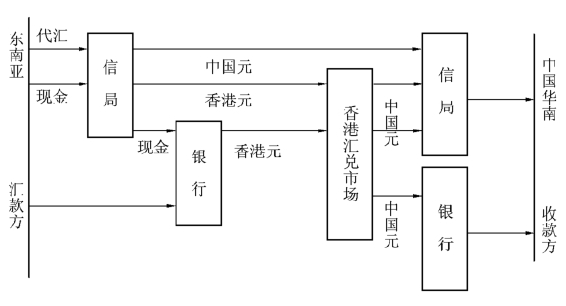 这种汇款方法,主要是如图所示的汇付方法,经香港的二重汇付特征很突出。此外,也有实不汇款,而是用商品贸易的形式与香港支付进口金相抵消的方法。另外,也有利用金银市场,利用新加坡和香港的币材差价完成汇款职能等方法,因而商品市场与外汇市场出现了相互促进的关系和作用。