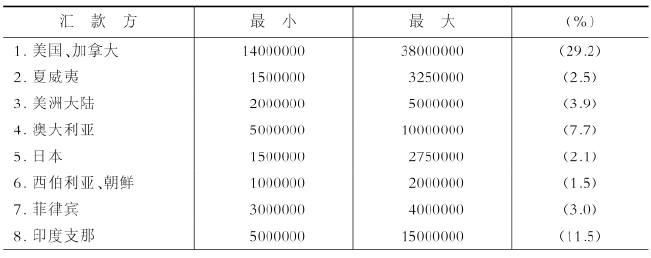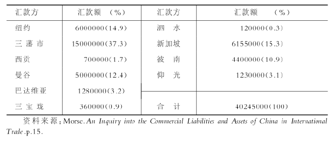 厦门(福建省)的海关税务司作了如下的概算,即在马尼拉、爪哇、海峡殖民地劳动者中有250万厦门人,他们每年向家乡的汇款在1000万美元以上,1903年从海外归乡的66000人,携带的现金就有600万美元。汕头(广东省)的税务司也明确地说,所有归乡苦力,把劳动所得的一部分亲自携带回来,另外他们受那些未归国者委托带回的现金每年也高达数百万美元。琼州(海南岛)、北海(广西省)来的报告也同样,陈述了该地域现金接受情况。这些无形(invisible)资金的供给,提供了足够的金额用以与货币——这一有形贸易的出超相抵消。这能够说明,数百万华侨的汇款,大概就是抵消作为当时债务国的中国的进出口中的入超中的一部分。