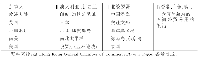 香港不同贸易对象的船舶入港量变化如图2-2所示。作为与香港的相邻性来看的地域Ⅲ,在分类上被分为中国沿岸及东南亚东部,虽然两者的比率不明,但分类Ⅴ上海对外贸易用帆船的主要活动领域是东南亚地域,把两者加起来考虑的话,可知香港处于中国与东南亚的中转站地位。另一方面,通过表2-12可以明确,从亚洲地域与香港相并列的另一个转口港新加坡的对外贸易关系中,可以看到东亚、东南亚地域,以香港和新加坡为中介,与印度进而与欧洲相联系。