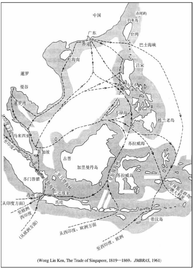 在东亚地域内部,在东南亚地域内部,特别是在包含两者的形式上,地域贸易的圆环有着几个历史性的存在。而且这些地域贸易圈是作为亚洲区域内经济构成要素的贸易单位而发挥作用的。在其内部,商品贸易和进行贸易的商人集团,具备了地域相互间的决算关系。在其外部,沿着其贸易圈的边缘,又形成了与其他贸易圈相联结的转口港,构成了广域贸易网的一部分。