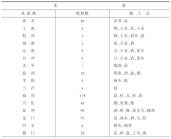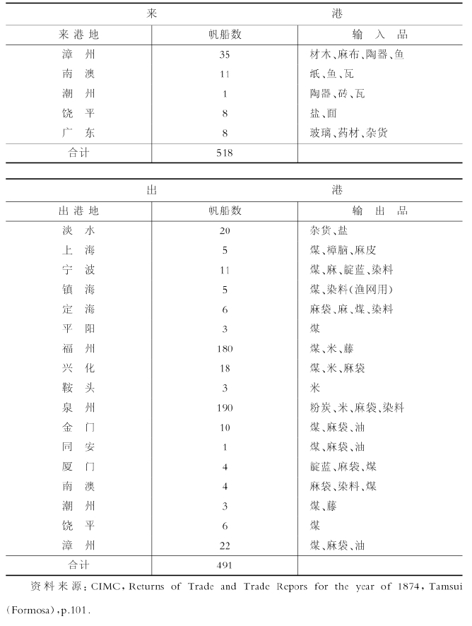 基隆港帆船贸易的对象港、出入港都以福州、泉州为最大,入港中居其次者为金门、兴化、漳州、厦门。厦门圈再加上泉州、漳州,台湾对岸的帆船贸易中,厦门就成为最大的地域了。另外,就贸易品来说,进口到台湾的以棉布、盐等日用品为主,从台湾出口的则以煤炭为主。还有,在帆船贸易中并不把茶作为贸易品,这表明茶已被纳入到出口外国的范畴了。这与课税额有关系,内地贸易与外国贸易存在价格差异,但对于其税率问题在第四章中再加以探讨。