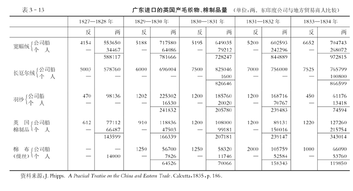 据表3-13,英国的毛织物、棉制品出口到广东,东印度公司与个人(地方贸易商)比较,前者在出口上占了压倒性的多数。另外,如表3-14所示,19世纪初,从加尔哥达开往广东的船舶,从事地方贸易的船占绝大多数。这些地方贸易船运送的货物,如表3-15所示,印度产的棉花和鸦片是两大宗商品,其他是印度、东南亚产的香料、海产品、药草等,都是向中国出口的,都是为在亚洲区域内进行贸易而运输的转口贸易。