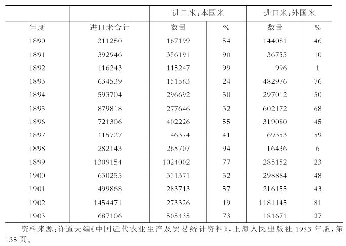 表3-17 厦门关进口米中,本国米与外国米的比较(1875-1903年)