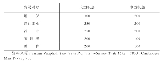 在1820年代初期,从中国沿海地域的江苏、浙江、福建、广东沿岸出海的中国帆船有222艘,载重量一艘平均是200吨。这些帆船的贸易所属者数量分布,日本20艘、菲律宾诸岛13艘、东非海诸岛4艘、西里伯斯2艘、文莱13艘、爪哇7艘、苏门答腊89艘(今印尼岛之一)、廖内省(今印尼地名)1艘、马来半岛东岸6艘、暹罗89艘、交趾20艘、柬埔寨9艘、东京(越南)20艘、新加坡8艘。在暹罗成为最大贸易对象的同时,还广泛地涉及到马来半岛、交趾半岛、日本、爪哇等更广阔的地区。