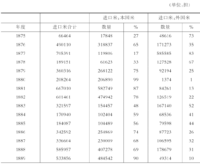 在西贡米的出口对象中,香港为最大,其中也包括了向厦门的再出口量。但在向厦门直接出口有记载的年份里,如前表所示,也就是从外国进口最多的年份。从这点可以看出,厦门的外国米进口,也与米的国际市场动向相关联。也就是说,围绕着厦门地域,形成了一个近邻内地市场、远距离国内市场、外洋东南亚市场这样三层市场关系,它们是相互影响、相互补充的市场构造。