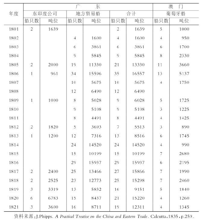 表3-14 从加尔哥达向中国出口船数(1801-1821年)