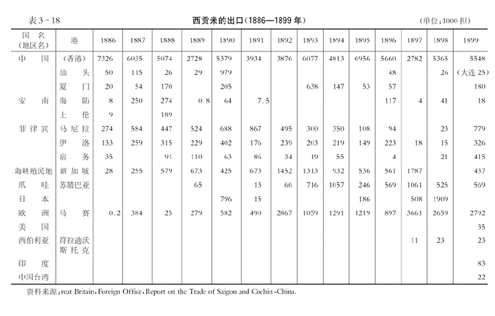 其中,关于东南亚的粮食生产,也有必要留意法国殖民统治下被开发的印度支那半岛,西贡米向东南亚、东亚出口增大的情况。表3-18表现出西贡米向亚洲市场、欧洲市场出口的状况。