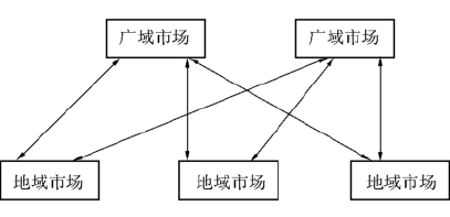 伴随着贸易圈的扩大,当地商人与广域商人共同分担市场,如下图所示,当地商人在小规模的地域市场活动,广域商人集团操作广域市场商品,并囊括了众多的地域市场。在亚洲市场上,印度商人和中国商人以移民为背景,从事着广域活动。