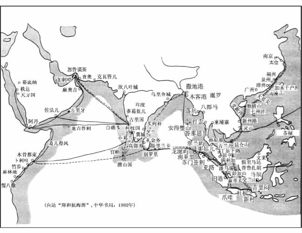 向华南的米进口,虽然暹罗是其最大的贸易国,却涉及了印度尼西亚、菲律宾、印度支那岛、马来亚半岛等东南亚整个区域。远不只是米贸易,以朝贡贸易关系为背景,华南与东南亚的贸易关系,存在着几条贸易通道。历史上,明代中期的郑和下西洋,极大地扩展了中国朝贡贸易的范围,而这一时期的朝贡贸易通道,则成为以后私人贸易得以扩大的基础(参照地图3-4郑和航海图)。