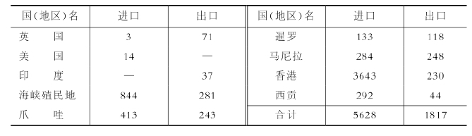 虽然以东南亚作为贸易对象国的中心,但可以清楚看到,以海峡殖民地为对象的贸易在其中也占有很大的比重,通过作为转口港的香港、新加坡进行着以进口为主的贸易。另外,处于厦门南方开放口岸的广东汕头港的对外贸易,也对进口对象香港、新加坡有所记载,《潮州志》就有与厦门贸易网同样特征的记载: