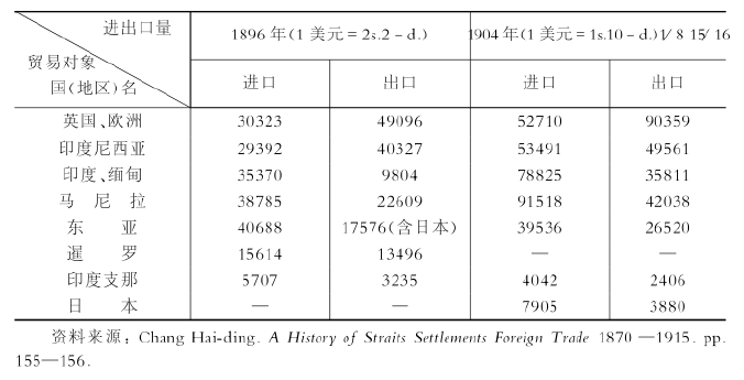 从这一表中可以看到贸易量变化的特征。作为以往贸易中心的大米仍然呈增加趋势,但就鸦片而言,受到19世纪末至20世纪初国际上鸦片贸易停止趋势的影响,作为其最大进口国的中国进口量减少,向新加坡的鸦片进出口却增大了。这一点可以看出,试图在东南亚地域找到鸦片销路的特征。另外锡和橡胶作为马来半岛的特产,就像欧美汽车产业的发展一样呈现急剧增加的趋势。