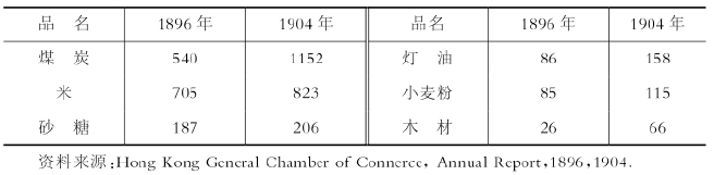 在香港转口的主要贸易品,如表3-22所示,占大宗者为煤炭、米、砂糖。煤炭之所以贸易商品中占最大量,原因在于它是船舶的燃料,也说明香港是作为煤炭补给基地、分配中转站而出现的。1905年进口量的顺序如下: