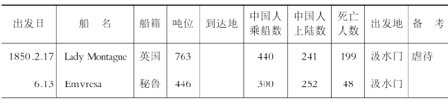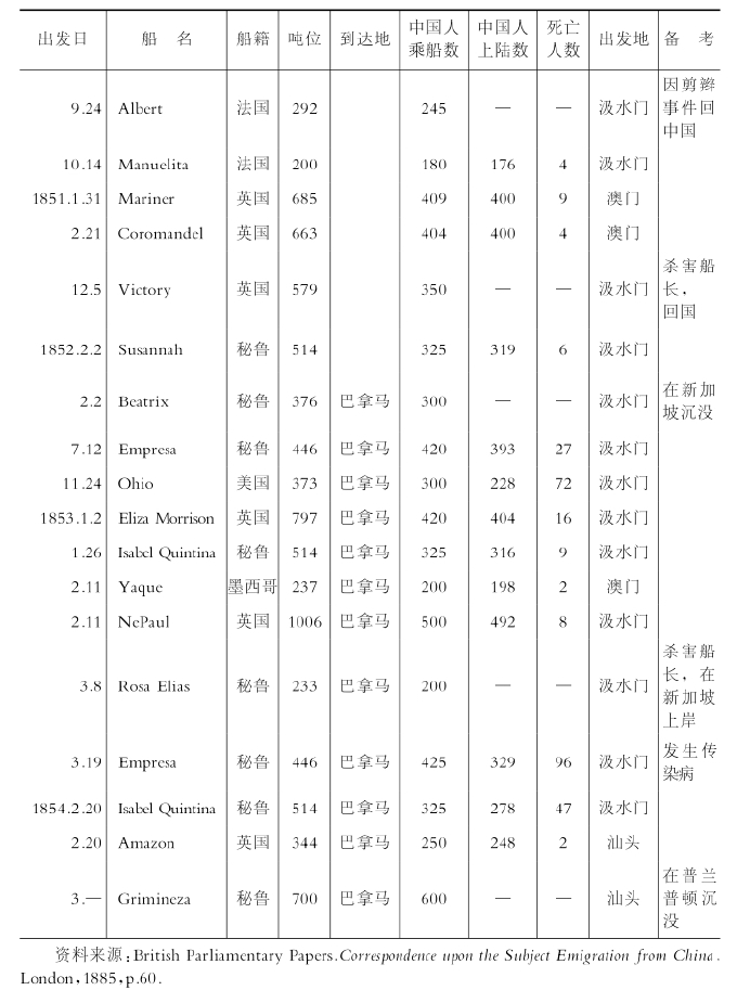 他在这里所说到的“虐待”,实质上是指作为奴隶贸易进行的所谓苦力贸易,中国劳动者被抓、运送途中的高死亡率和到了移民地的超强劳动。但是,另一方面从人道的观点出发,主要由于高死亡率而带来经济损失这一“经济的”理由,在中国当地以及西印度群岛等需要劳动力的地方就采用了契约移民的方法。但是,如表3-27所见,只以前往古巴的契约移民输送过程为例,就出现过1/3人员发生事故的情况。这表明移民输送相当危险。1870年日本横滨就发生了类似的玛丽亚·露丝号事件。1860年开始真正经由香港的中国移民所到达的目的地是:旧金山、澳大利亚、温哥华、英国属西印度群岛、孟买、塔希提岛、荷兰属西印度群岛、火奴鲁鲁、婆罗洲、纳闽岛、爪哇等。1857年,以英国的圭亚那、特立尼达的契约为例,中介人托马斯·杰拉德受24名业主之托,每一中国人平均收25英镑手续费,运送了总数2990名中国劳动力。契约规定了报酬、支付方式以及提供衣食住等问题。但是,由于移民当事人向契约业主和中介人(外国、中国双方的)借贷船费以及向本国家人汇款而欠债,所以契约内容并不充分。在中国移民与印度移民相比较的问题上,也有人这样描写道:“把印度人与中国人移民相比较的话,中国人更加有利。印度人的确比中国人更老实,更容易操纵。但是中国人的体力强壮,勤劳努力,热心存钱,地位在不断上升。”指出了中国人移民利益偏好的状况。