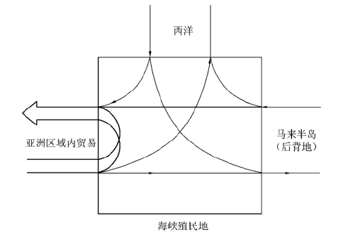 如果将新加坡的转口贸易用概念图来表示,如图3-4所示,可以看出新加坡主要有三个方面的特征:一是马来半岛拥有着广阔的生产地域和消费市场,新加坡主要从事马来半岛的出口贸易;二是由于新加坡拥有集散地市场和决算市场的功能,所以能够从事亚洲区域内的中转贸易;其三,增加一定的附加值,新加坡就能成为与西洋市场贸易的中转站。