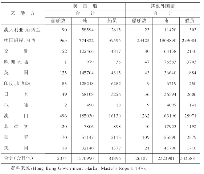 关于香港与上述这些不同贸易对象的关系,可以通过对来港外国船的船舶数来分析(见表3-21)。香港作为“自由港”,对货物没有课税,据船舶统计显示,来港的国家中,英国船和其他的外国船一起,在与中国沿岸的贸易中占了压倒性的多数。位于沿岸贸易一部分的位置,且正处在与外国贸易切点上的澳门紧随其后。多数为东南亚的航运,从日本来的船舶也在增大之中。