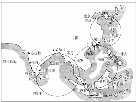 (2)发挥中国沿岸贸易转口基地的作用,进行中国某一地域向其他地域的输入与输出中转。而且也不断地在华南与东南亚之间拓展中国的沿岸贸易,构成了华侨经济圈。