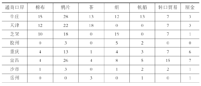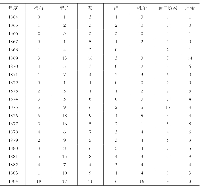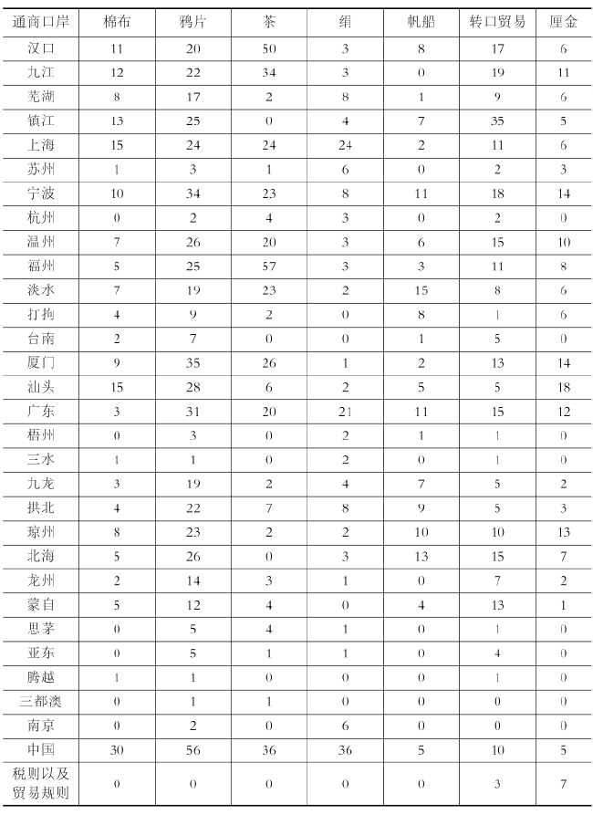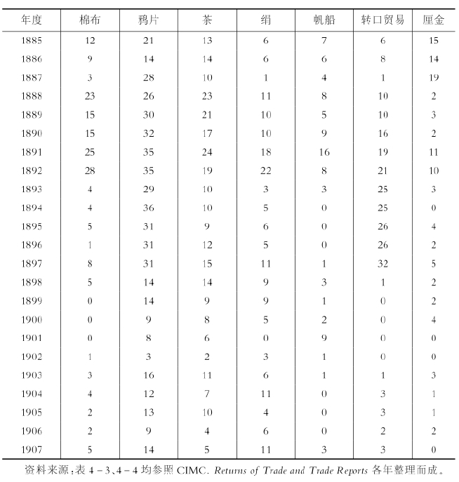 海关报告的总论(general trade report)是一篇记录了贸易特征、并且将其和以前的情况进行比较、同时展望今后问题的卷头论文。表4-3和表4-4综合了从1864年全国统一的报告出版时起、直到1907年为止的上述海关报告以及各港口的历年报告,并且统计记录了这期间主要出现的问题以及这些问题出现的频率。