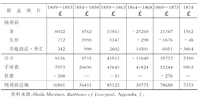 从第三个原因——对于英国商人来说中国贸易没有魅力——这一点来说,正如在表4-5中所反映的那样,以航运业为中心的利物浦商人组成的太古洋行,在茶叶和生丝的贸易中,从19世纪50年代末开始,直到19世纪70年代初期,取得了巨大的利润。但是,从英国的棉制品贸易来看,值得注意的是,英国商人并不采用以自身资本为基础的贸易,而是采取收取利息等手续费的方式进行贸易,他们不会用自己的资金来冒险投资。尽管利益很小,但他们宁可采用安全的方法来收取汇兑等方面的手续费用。从以上这些情况可以看出当时英国商人在中英贸易关系中的商品比重的差异。