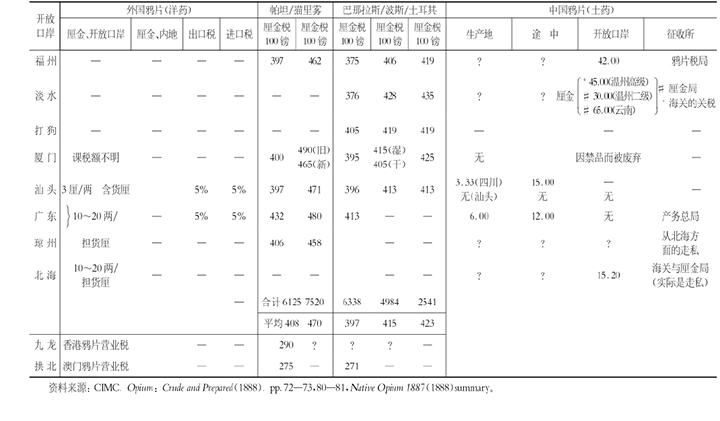 从鸦片的课税情况来看,通商口岸对进口鸦片与其他进口商品实行同样的政策,基本上都课以进口或出口税的5%。但是,这种情况在全国却并非一律如此,比如,有的通商口岸要缴纳绝对额,更有甚者比如九龙和拱北,在鸦片的税收上还要缴纳营业税。这两地分别是英国、葡萄牙的殖民地,这种课税情况可以认为是与中国方面相妥协的一种结果。而内地的厘金税方面,虽然每项情况都不同,但其共同点就是都对绝对额进行课税,其客税额度按市场价格高低,以马尔瓦鸦片、帕特纳鸦片、贝内来斯鸦片的顺序,课以与从价税相似的税金。