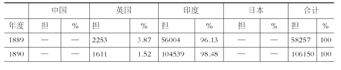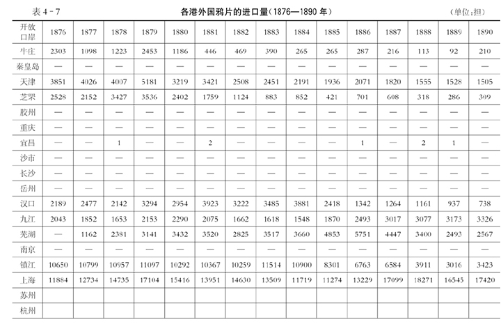 到了19世纪80年代,海关税务司才发现这种加工鸦片和中国产鸦片的混合局面,而且由于厘金等流通税的比较引起鸦片在内地的流通。不光在通商口岸,就连中国的内地市场,这两者都已进入了竞争阶段。从19世纪后半期到20世纪初期这一段时间,鸦片进口出现了很大的转变,这种转变确切地说是从19世纪80年代中叶开始的。表4-7中反映了这一变化。在此可以看到:以19世纪70年代末开始到80年代初这一期间为顶点,华北、华中的鸦片进口开始减少;与此相反,华南的进口反而有增加的倾向;上海进口的增加,则在统计上使扬子江地区的统计数字发生变化。进口的总额维持在7万担到8万担左右,但从1895年以后,进口总量由5万担减少到4万担,可以看出中国国产鸦片的影响越来越显著。