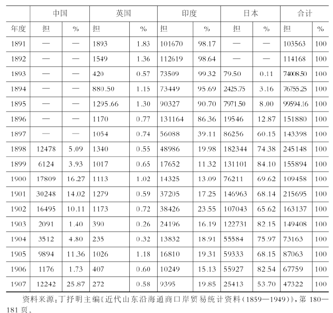 从这个价格比可以看出,印度棉线价格最便宜。这些印度棉线被发送到云南、广西、汕头、广东、福州、厦门、牛庄等地。印度主要提供低支棉线,日本则主要提供中支棉线,英国则主要提供高支棉线,而日本棉线则处于跨越印度、英国两者的地位。虽然在价格方面看不出有什么明显的差距,但是在中国市场的棉线贩卖方面上则可以看出很强的地域分割性。比如说,日本棉线在华北市场的影响力很大。正如表4-6所示,从19世纪末到20世纪初,日本棉线加入到此前占有绝大部分市场份额的印度棉线市场,两者地位发生了巨大的转变,在那之后,日本棉线和印度棉线一道,与中国的机制棉线进行着激烈的市场竞争。这种倾向一直持续到第一次世界大战中国棉线得到飞跃性发展的时期。