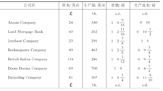 但印度茶叶的生产是在1865年英国金融恐慌之后才开始的,在阿萨姆邦与锡兰等地茶叶被引入种植园并进行大规模生产。表4-10反映了茶叶栽培公司在锡兰的经营状况。