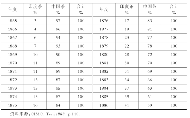 中国茶叶(红茶、绿茶)的出口构成也出现了变化。到19世纪80年代,一直作为中国红茶最大出口港的福州,突然急剧衰退下去,起因就在于一直被中国茶独占的市场被印度茶、锡兰茶以及日本茶夺取了。
